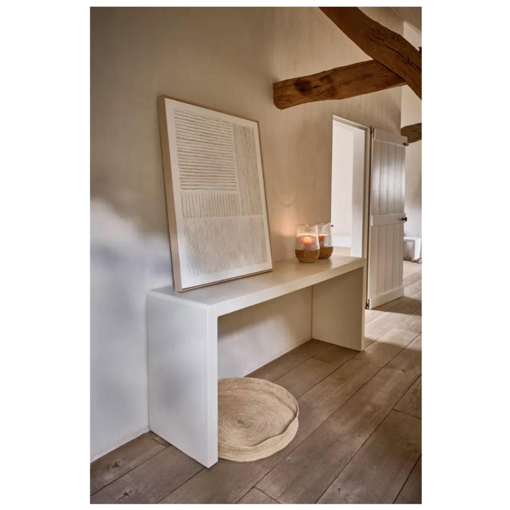 Une ode à la simplicité, à la lumière et à la matière. Le tableau BLANCHE de Pomax est une pièce d'art minimaliste qui captive le regard par sa richesse texturale. Entièrement monochrome, cette œuvre tire sa force de son travail en relief : la matière est appliquée en épaisseur puis gravée à la main pour créer des motifs de lignes parallèles, tantôt horizontales, tantôt verticales. Ce jeu de stries crée un rythme visuel et un dialogue fascinant avec la lumière, qui révèle de nouvelles ombres et de nouveaux détails tout au long de la journée. Encadré de bois de pin naturel, ce tableau apporte une présence apaisante et une touche de sophistication discrète.