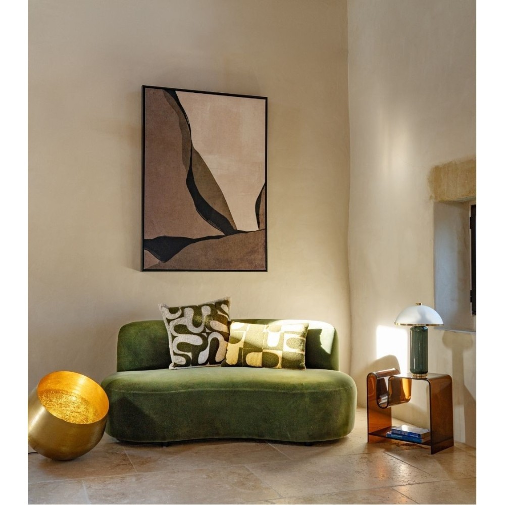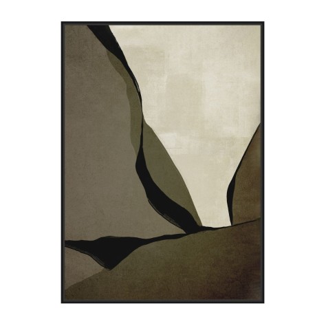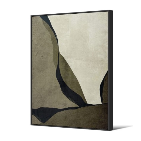 Une œuvre d'art qui se vit autant par le regard que par le toucher. Ce tableau est une pièce d'exception, dont l'originalité réside dans son support unique : une toile en velours ras. Cette matière confère aux couleurs une profondeur et une matité incomparables, absorbant la lumière pour une présence douce et feutrée, sans aucun reflet. Le design est une composition abstraite et puissante, évoquant un paysage minéral ou les strates géologiques d'un canyon. De grandes formes organiques aux teintes terreuses – kaki, taupe, noir et écru – s'agencent dans une harmonie brute et apaisante.