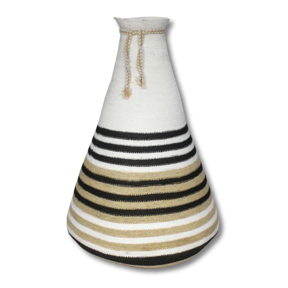 Dans la même veine spectaculaire que notre vase Goa, le panier Madras explore une autre facette du graphisme ethnique. Entièrement façonné en herbier marin tressé, il présente une succession de fines rayures noires, blanches et naturelles qui créent un rythme visuel captivant. La matière brute et authentique de la fibre végétale vient adoucir la rigueur du motif, pour un équilibre parfait. Sa silhouette conique et sa belle hauteur de 69 cm en font une véritable sculpture textile, une pièce forte qui habille un espace avec élégance et originalité.