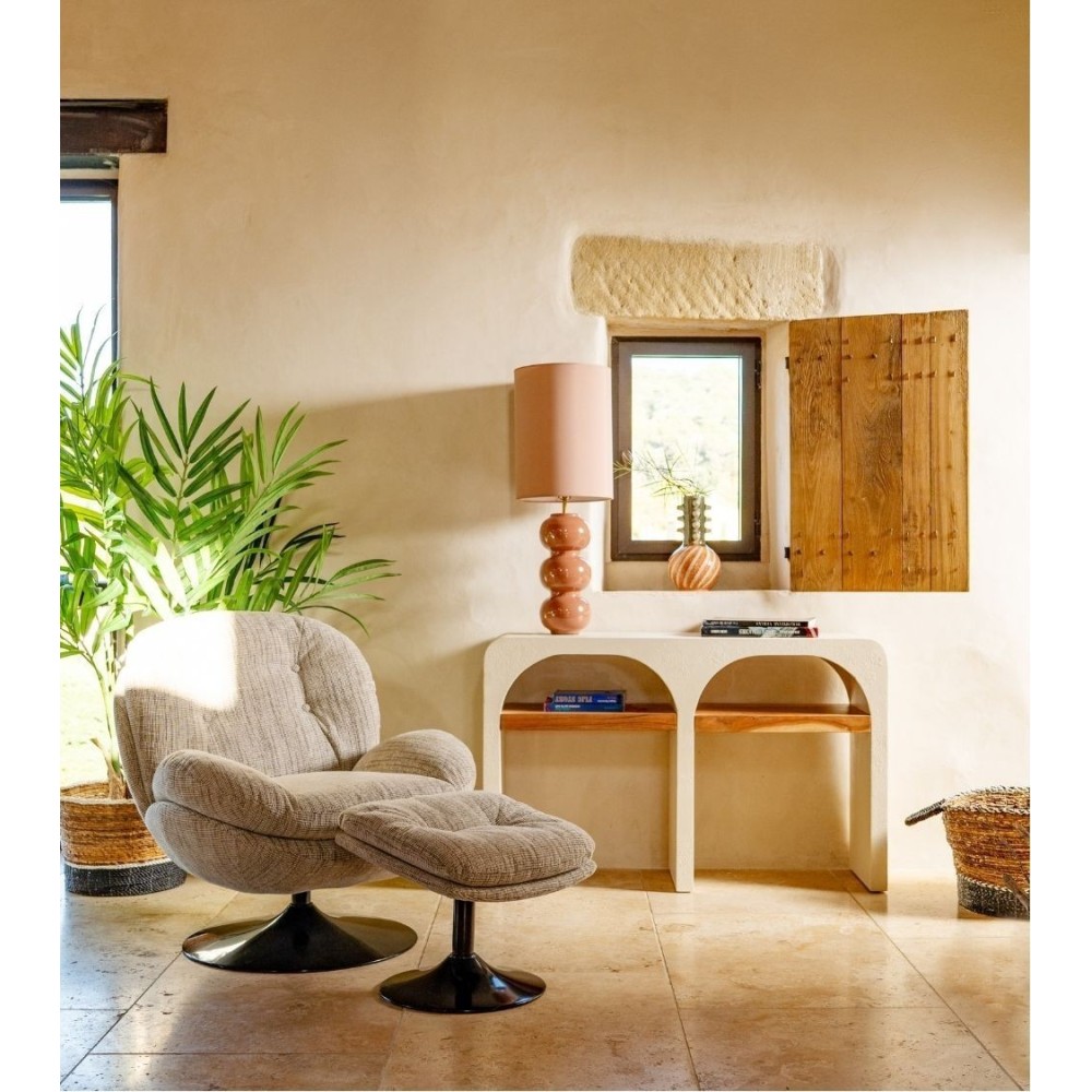 Plus qu'une lampe, une véritable sculpture. La lampe à poser Pila est une pièce de design qui impose son style avec audace et élégance. Son pied est la star : une succession de trois sphères généreuses en fer laqué, qui lui donne une allure de totem contemporain. Sa finition brillante et sa couleur terracotta, chaude et profonde, accrochent le regard et réchauffent l'atmosphère. Elle est surmontée d'un grand abat-jour cylindrique en coton de la même teinte, créant une harmonie monochrome très chic qui diffuse une lumière douce et tamisée.