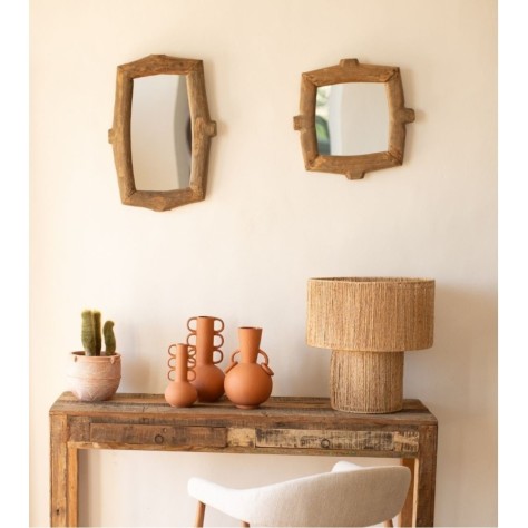 Bien plus qu'un simple miroir, Guadalupe est une pièce de caractère qui invite au voyage. Son cadre sculptural, taillé dans du bois recyclé brut, lui confère une âme et une authenticité rares. Chaque modèle est unique, portant les marques de son histoire passée – une patine, des nuances, des aspérités qui en font un objet inimitable. Sa forme atypique, presque totémique, en fait un point focal instantané, une fenêtre sur un ailleurs. Ses dimensions contenues (40x40 cm) le rendent facile à intégrer partout où vous souhaitez ajouter une touche d'artisanat et d'originalité.