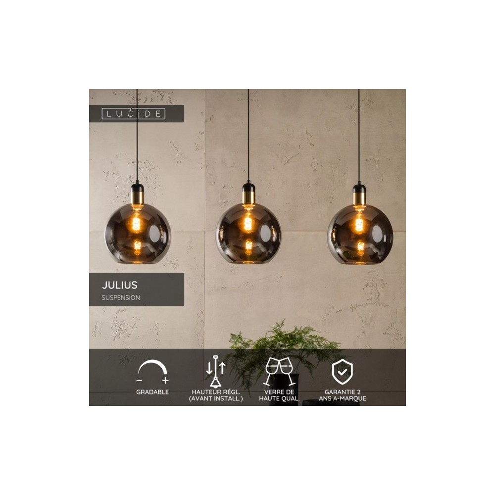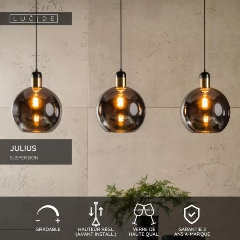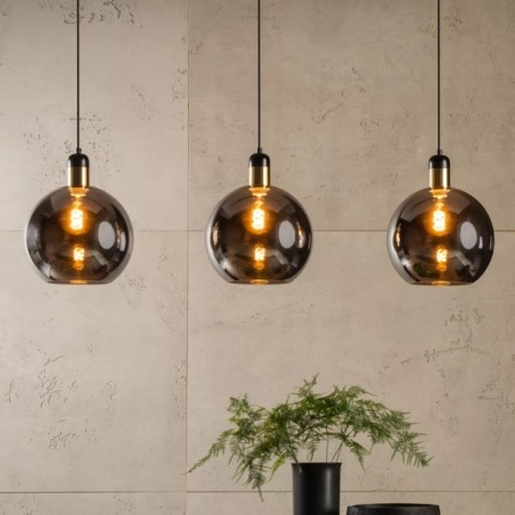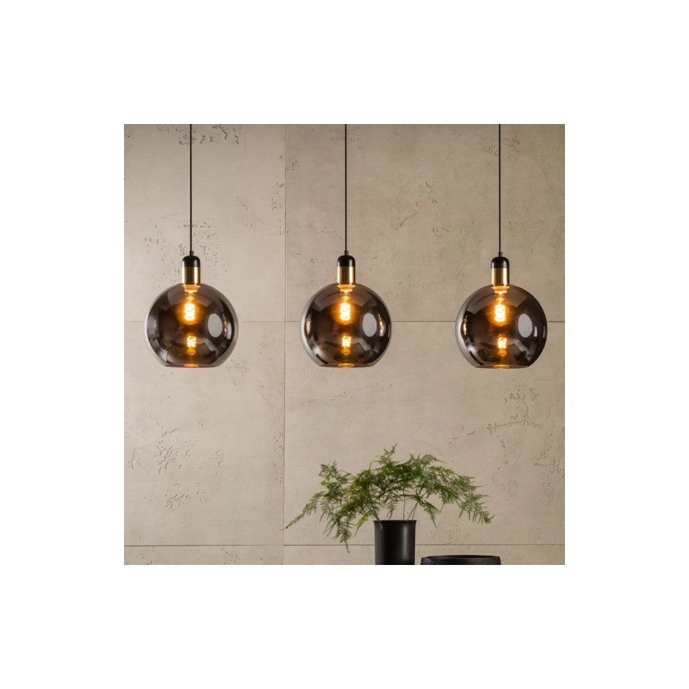 Structurez et illuminez votre espace avec la suspension barre Julius, un alignement graphique de trois globes en verre fumé, idéale pour une table à manger ou un îlot.
