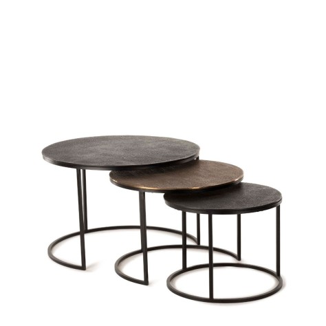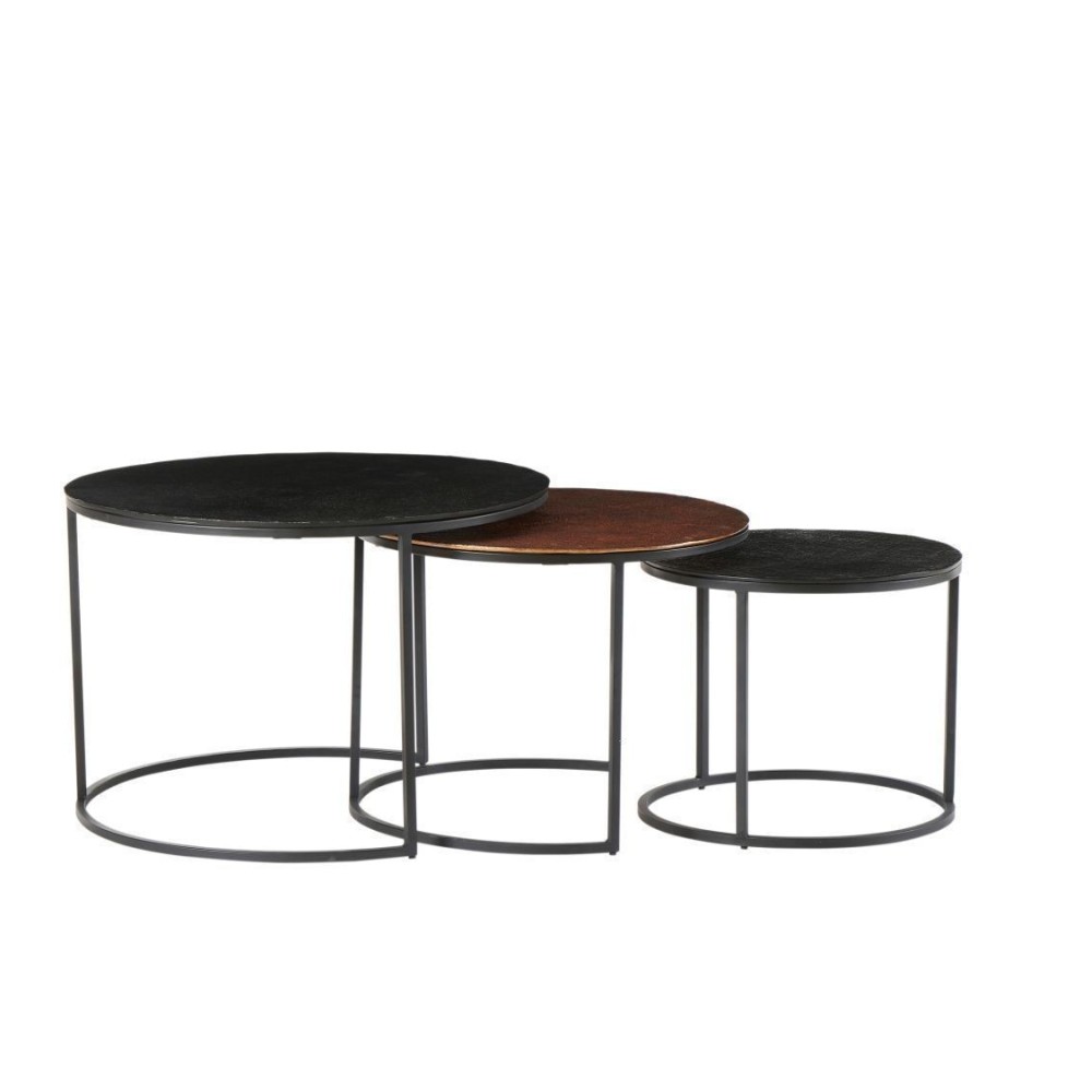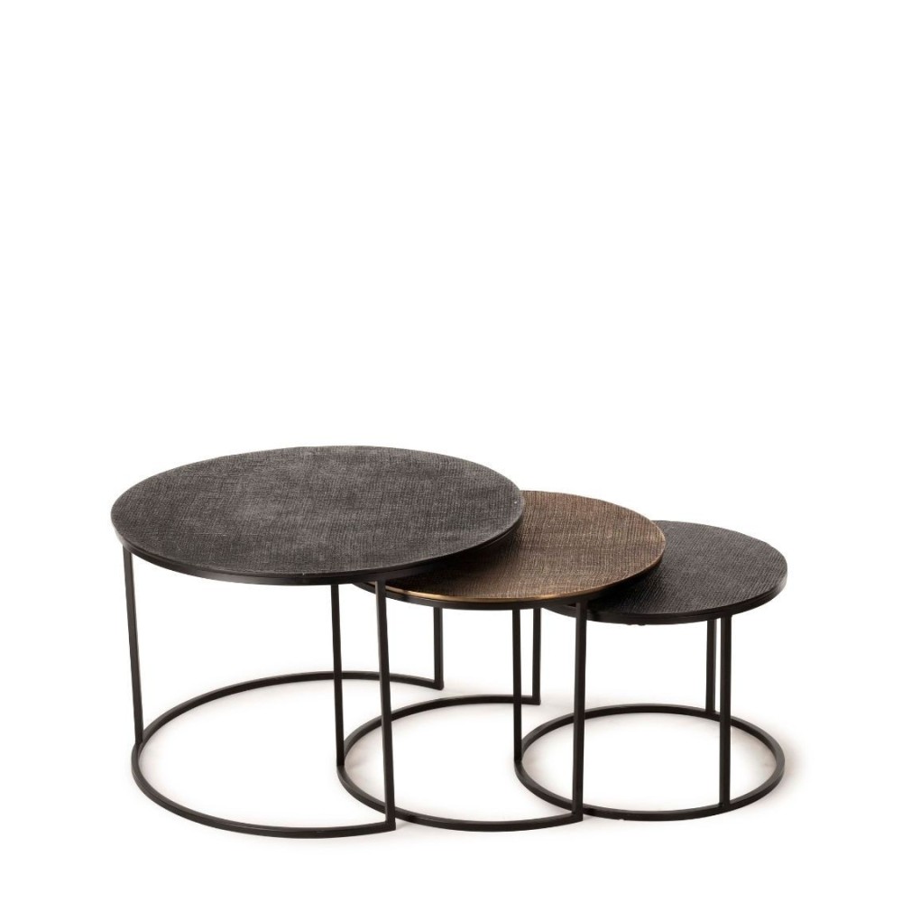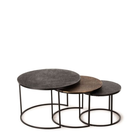 Jouez avec les volumes et les matières grâce au set de 3 tables basses gigognes Yuli, alliant des plateaux texturés en aluminium noir et doré à une structure en fer.